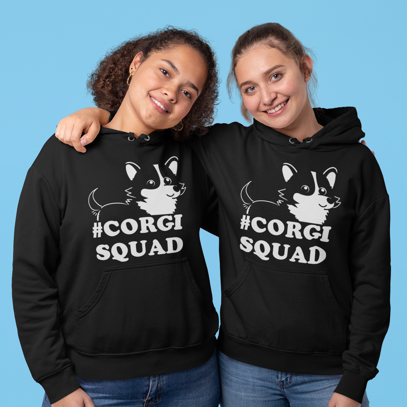 Join the Corgi Squad! A unisex heavy blend hooded sweatshirt is relaxation itself. The material is a thick blend of cotton and polyester. This makes for a plush, soft feel alongside warmth. It's also a great surface for printing. There are no side seams. A spacious kangaroo pocket hangs in front. The hood's drawstring is the same color as the base sweater.